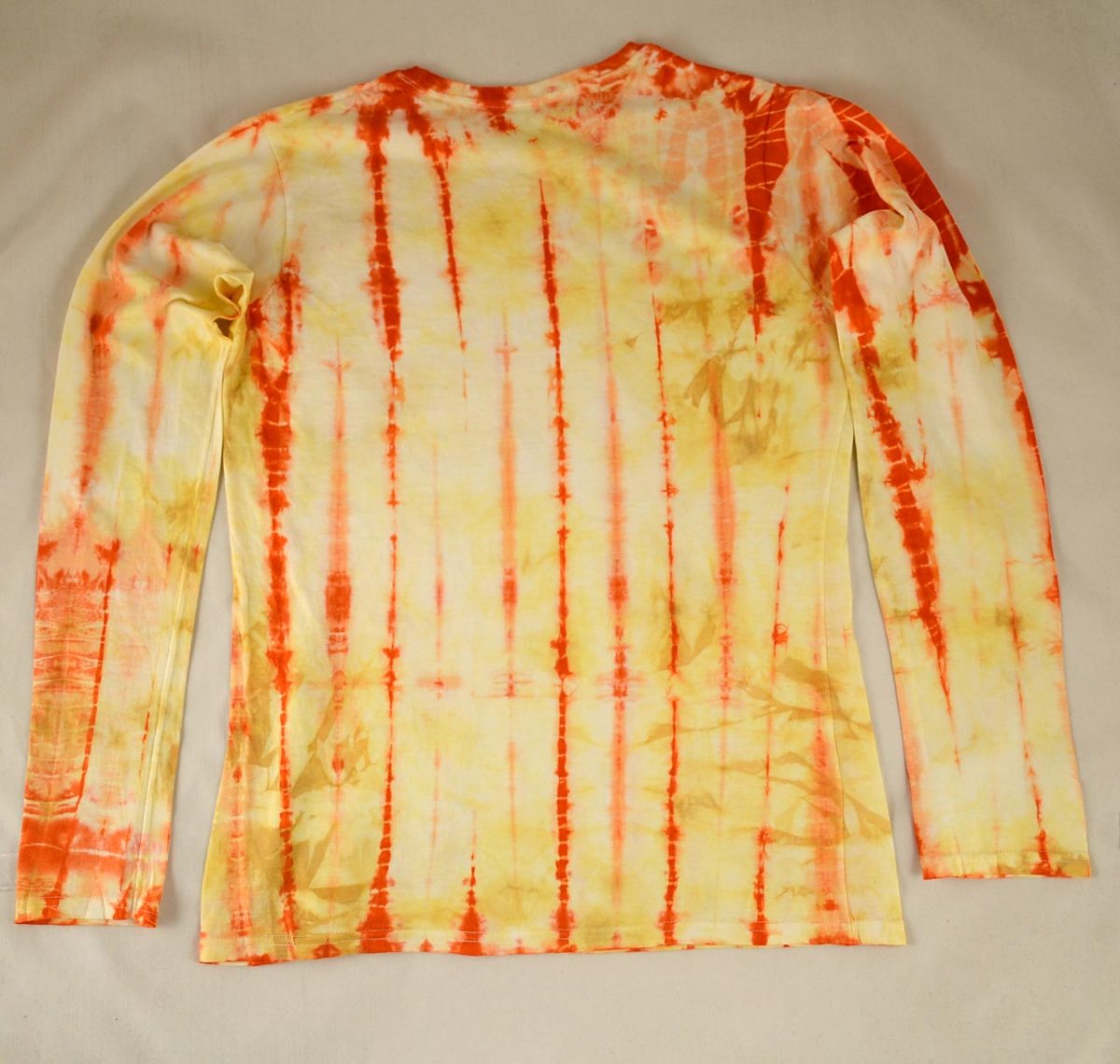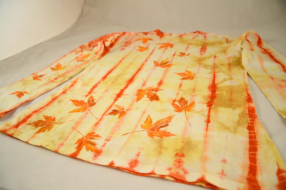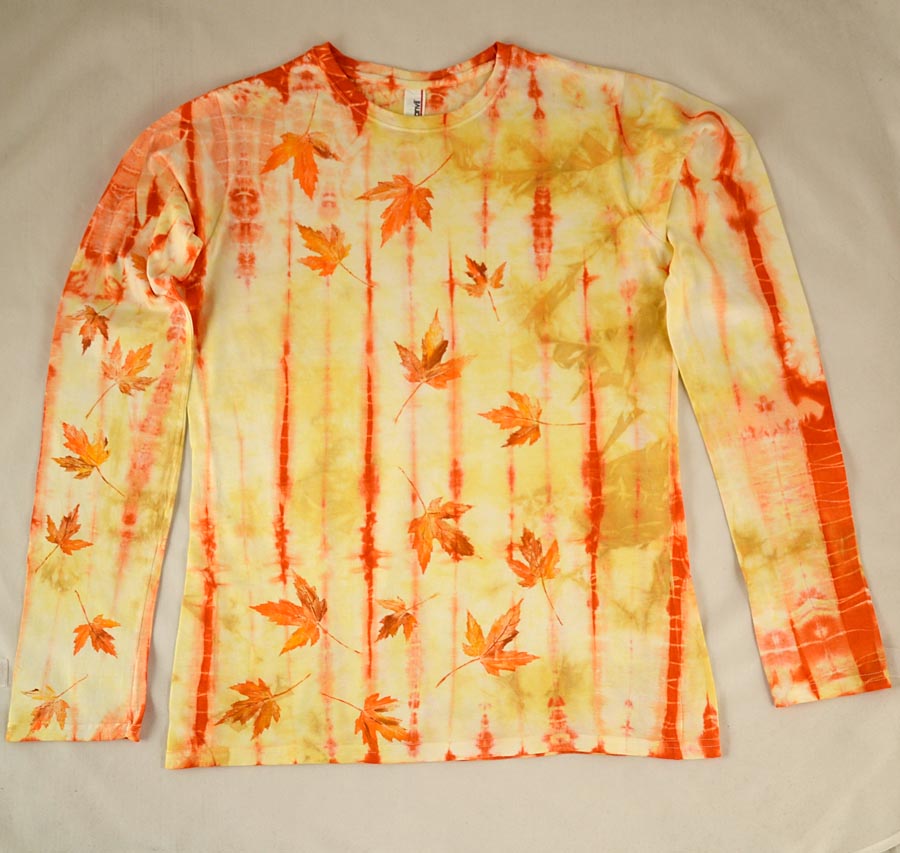 Dámské žluto-oranžové batikované triko s dlouhými rukávy, na přední straně natisknuté barevné javorové listy, velikost L.
