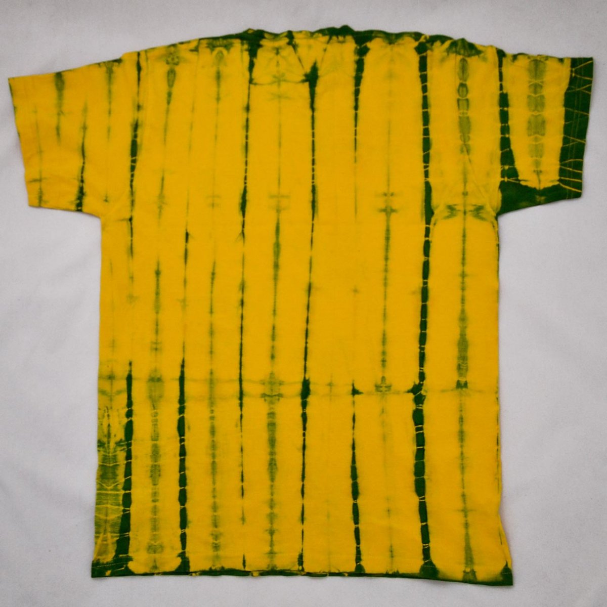 Žluté triko batikované zelenou barvou, na přední straně natisknuté zelené javorové listy, velikost L.