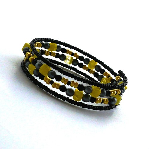 Kombinace šedých voskovaných perliček a žlutých a černých skleněných korálků je po krajích obklopena drobnými černými skleněnými korálky. Všechny korálky jsou navlečeny na čtyřech řadách paměťového drátku (= i přes velké roztažení se náramek vrátí do původního tvaru).