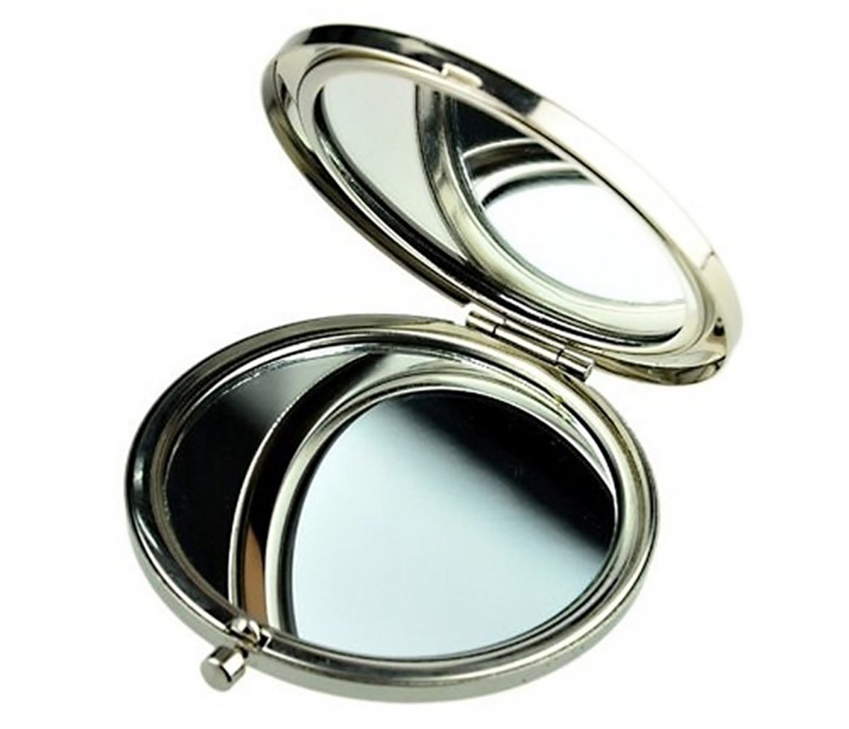 zrcátko - otevírací, průměr 70 mm, průměr motivu 57 mm, obsahuje 2 zrcátka - běžné a zvětšovací (kosmetické), barva platinová