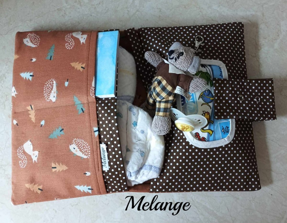 Je to velká kapsa podlepená,s kapsičkami na plenky,na vlhčené ubrousky,na krém a třeba i na mobil,poutko na dudlík nebo hračky.