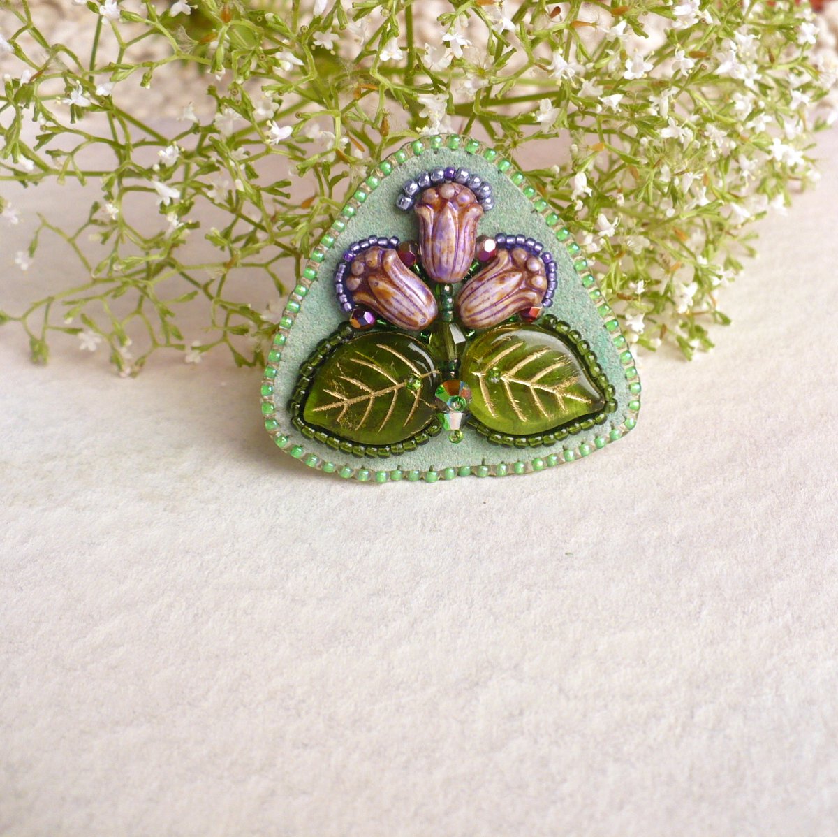 Použit japonský rokail Toho v barvách purpurová metalická, šeříková, zelená, sv. zelená s listrem. Šito nití nymo. Mačkané korálky Rutkovský, mačkané korálky se zlatým zátěrem. Ohňovky s pokovem a sluníčka Swarovski.