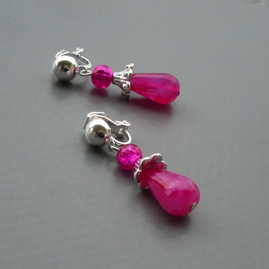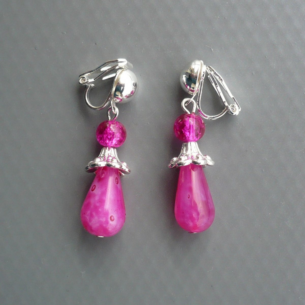 Náušnice jsou z horního fuchsiově růžového skleněného korálku s ozdobnou vnitřní rádoby popraskanou strukturou, ozdobného bižuterního komponentu stříbrné barvy a velké fuchsiově růžové mourované skleněné kapky.