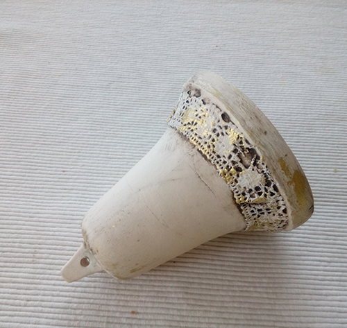 Keramika barvená glazurou a oxydem manganu s krajkovým motivem, patinovaná restaurátorským zlatým voskem. Zvoní