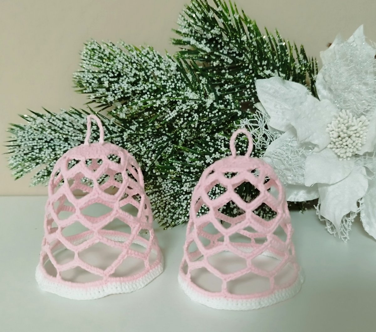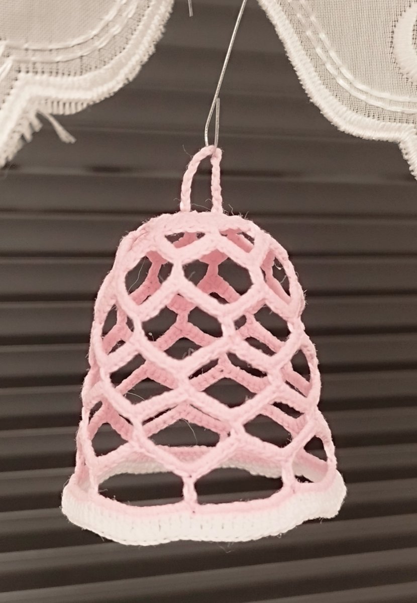 Zvoneček menší velikosti. Uháčkován z růžové příze, bíle olemován.