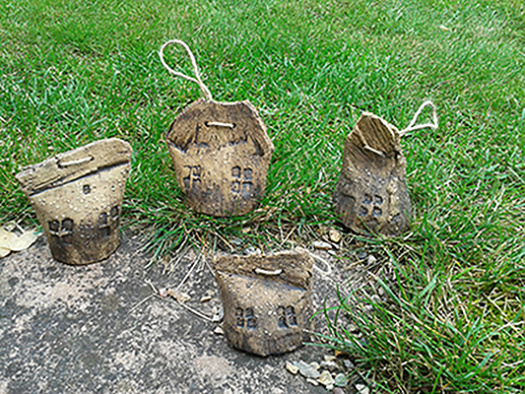 Zvonečky ze šamotové hlíny, vymývané a barvené burelem. Mají kuličku a zvoní. Chaloupky pro lesní a luční tvorečky.