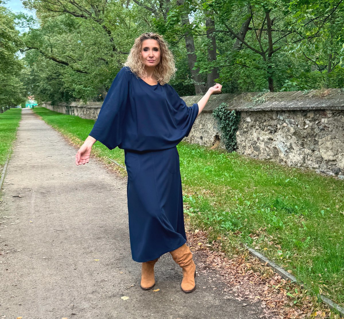 Zvonová sukně je ušitá ze směsového středně silného úpletu (Vis/pes/el). Pásek je pružný (vyztužený proti vytažení). Sukně má klasické vnitřní kapsy.