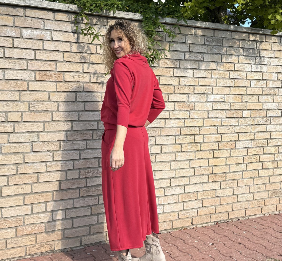Zvonová sukně je ušitá ze směsového středně silného úpletu (Vis/pes/el). Pásek je pružný (vyztužený proti vytažení). Sukně má klasické vnitřní kapsy.