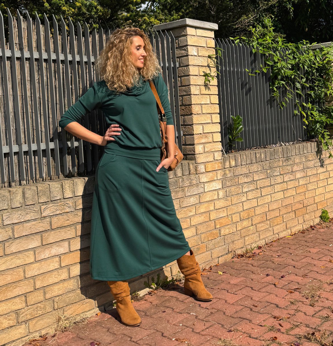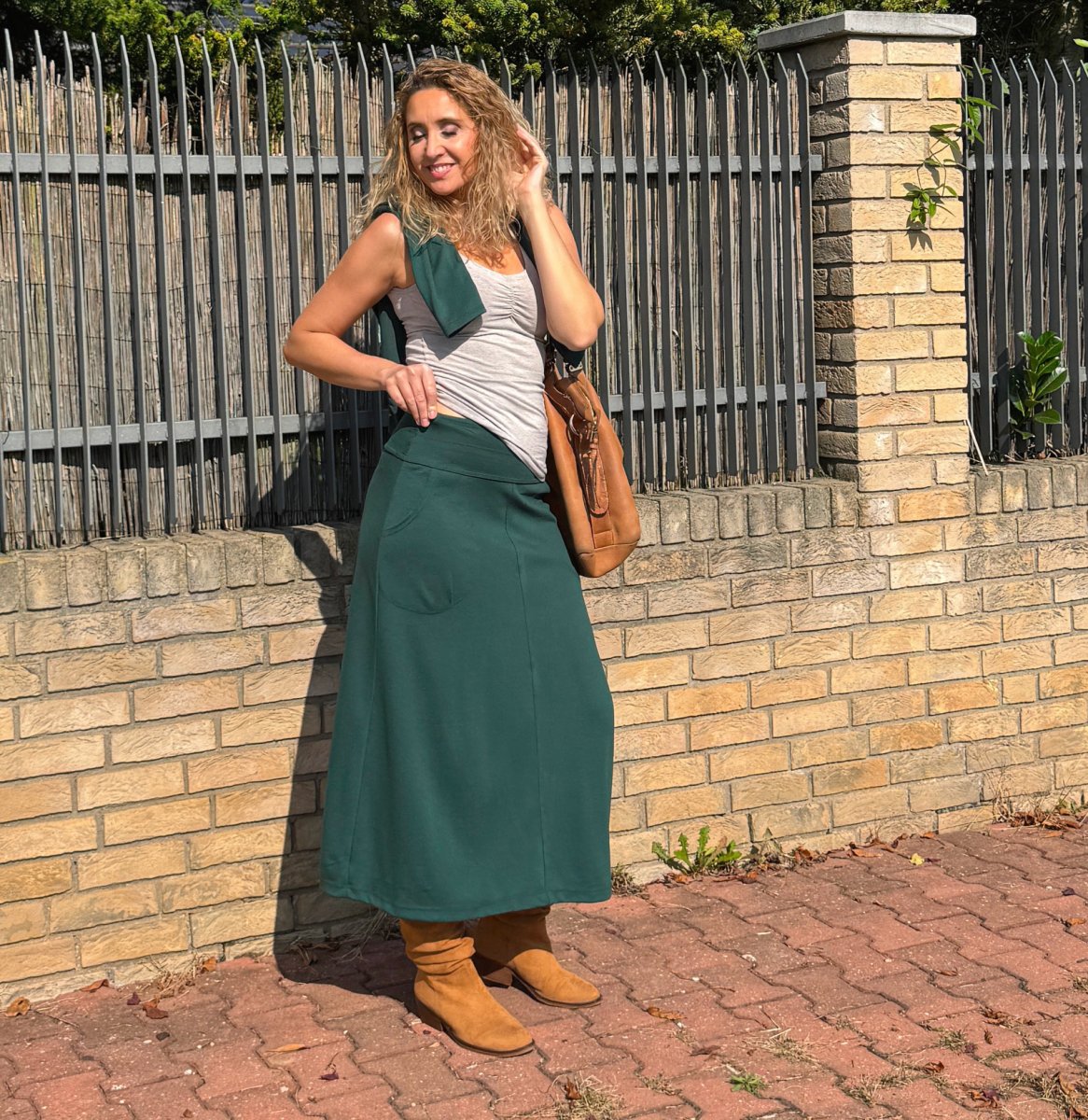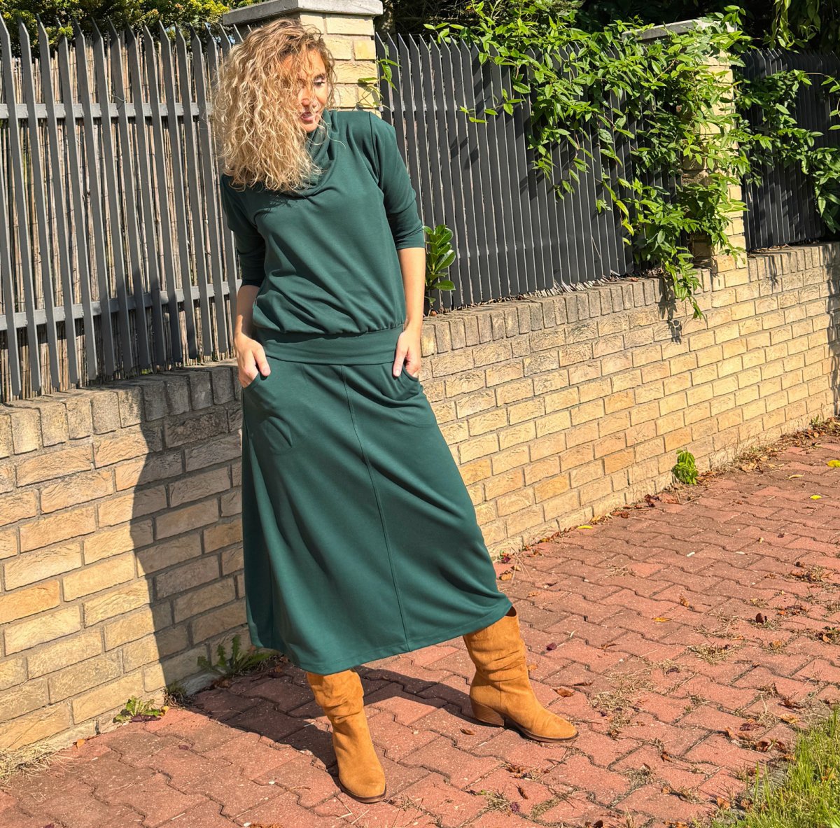 Zvonová sukně je ušitá ze směsového středně silného úpletu (Vis/pes/el). Pásek je pružný (vyztužený proti vytažení). Sukně má klasické vnitřní kapsy.