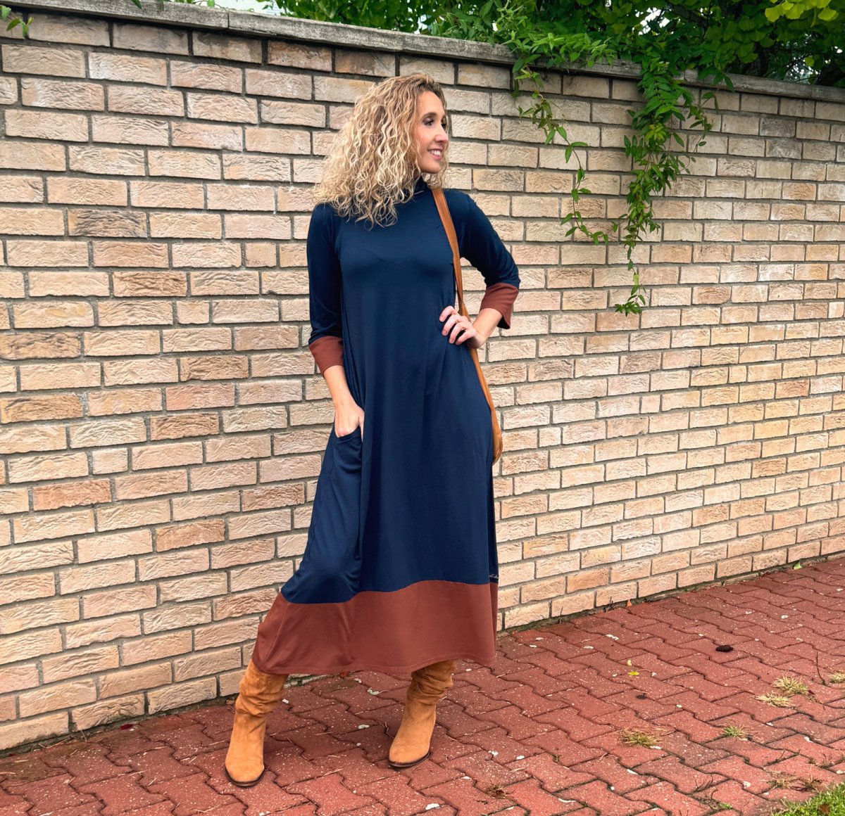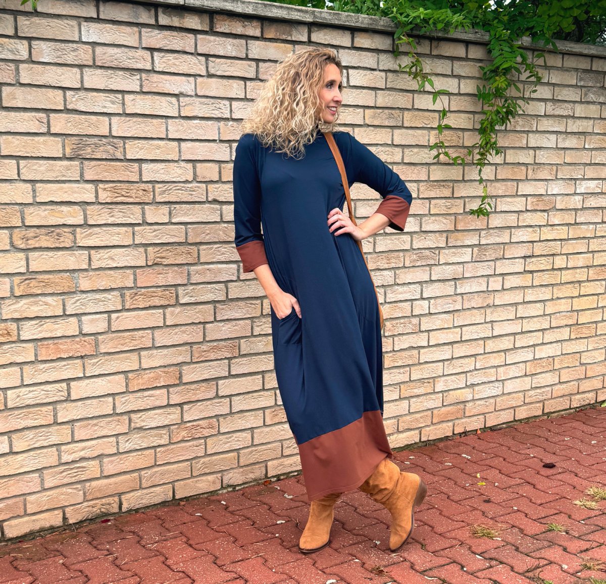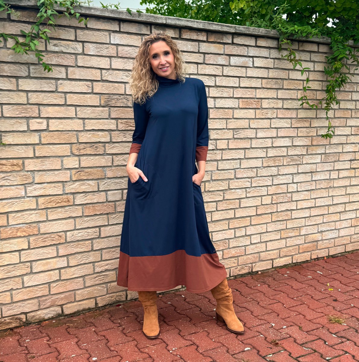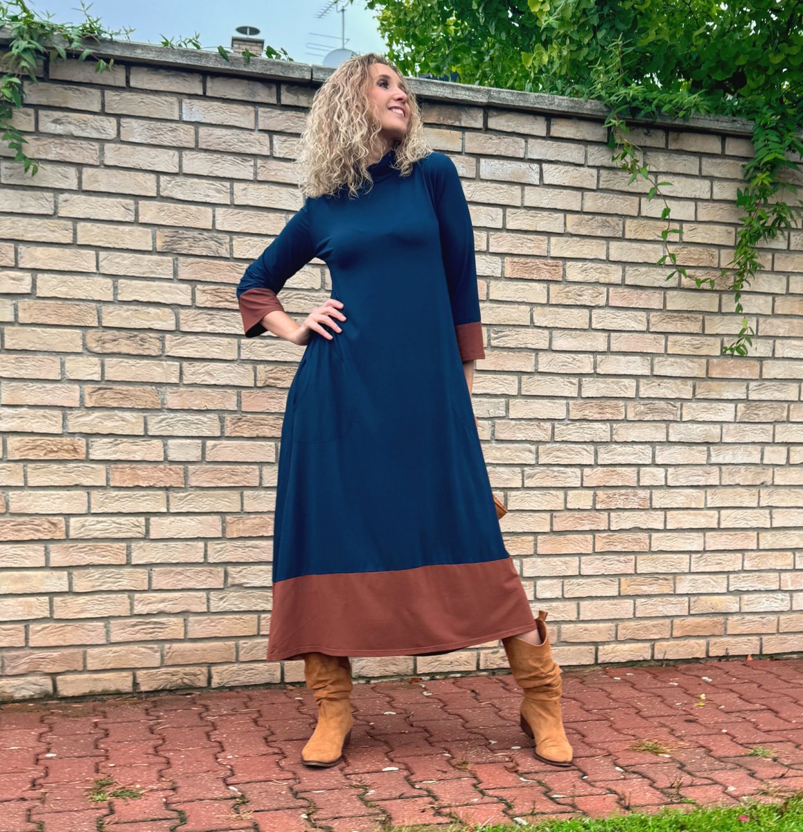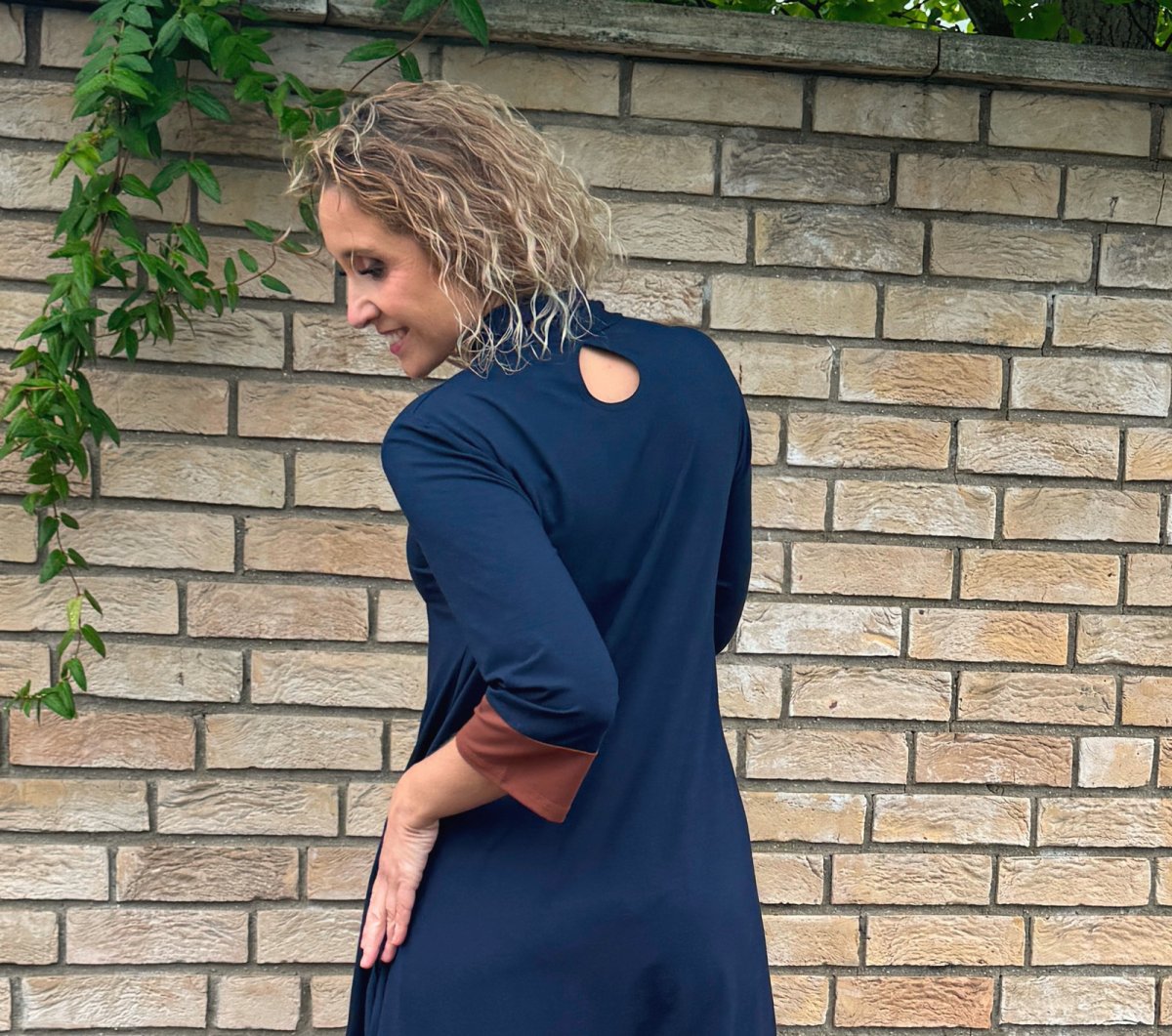 Střih je pohodlný, sukně je rozšířená do zvonu. Šaty mají na zádech ozdobnou slzu. V bočních švech jsou kapsy. Rukáv 3/4 délka