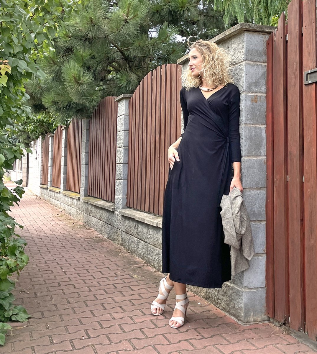 Zavinovací šaty se zvonovou sukní jsou ušité z pružného splývavého úpletu viskóza/elastan. Na sukni jsou boční kapsy.