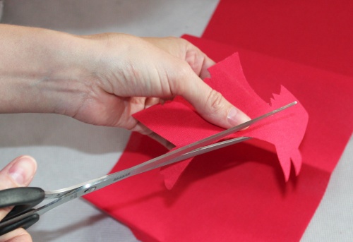 - Vystřihla jsem obrázek psa z červené samolepící záplaty (samolepící záplatu jsem pořídila v galanterii za 15 Kč) a nažehlením jsem psa na tričko „přilepila“
