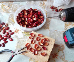 Nakonec přijde na řadu vrtačka. Na držení skořápky používám tenké kleštičky, abych si náhodou neprovrtala i prsty. Jako podložku používám dřevěný špalík. Není to jen tak, skořápka má tendenci se protáčet spolu s vrtákem. Při vrtání některá skořápka praskne, tak se musí vyhodit.